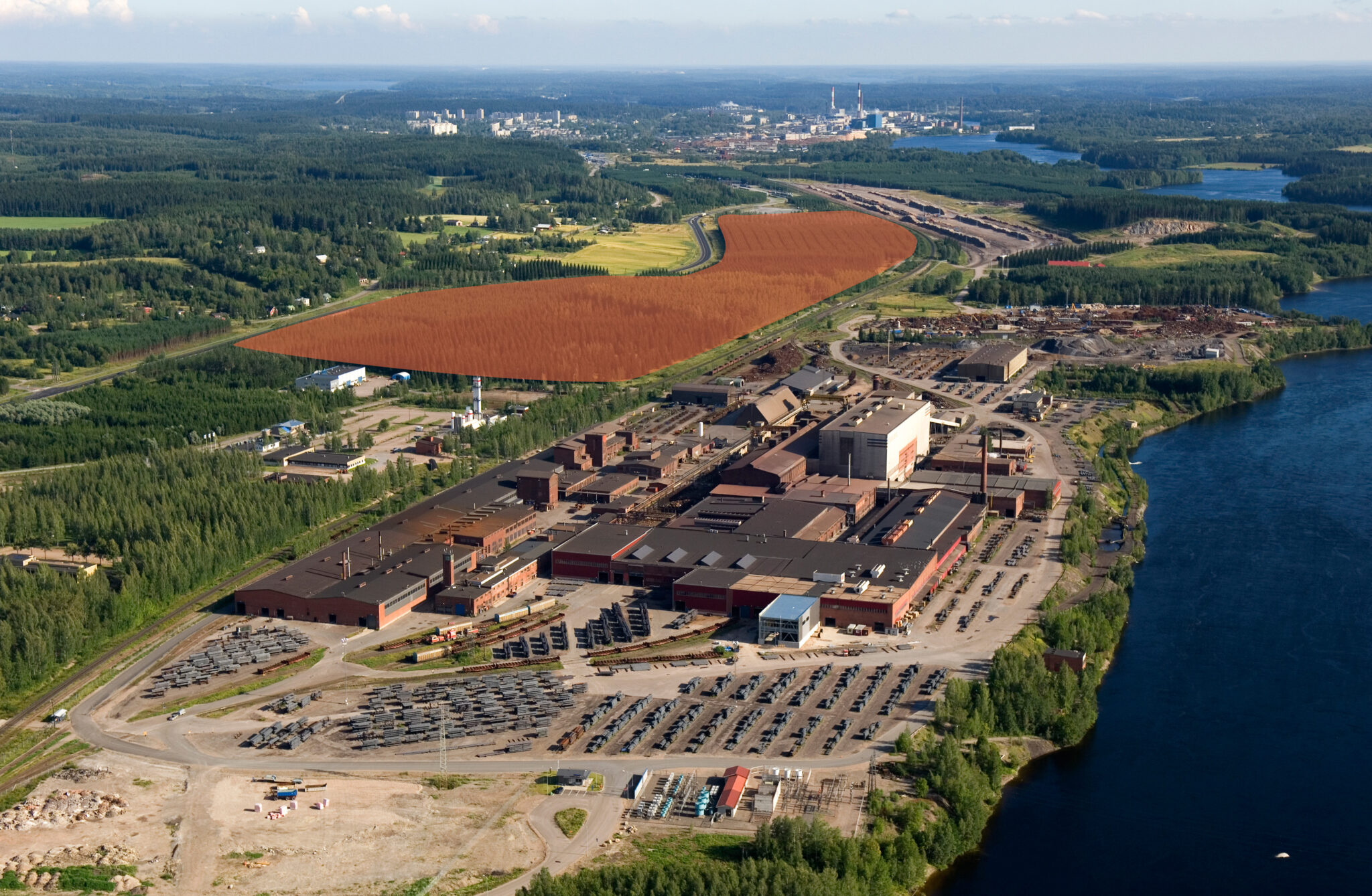 Imatra stad och det norska bolaget Norsk e-Fuel har ingått ett reservationsavtal om en tomt på sammanlagt cirka 20 hektar i Pelkolaområdet vid finsk-ryska gränsen, i omedelbar närhet av Ovakos stålverk. I avtalet ingår dessutom en option på ytterligare ett område av nästan motsvarande storlek. Foto: Imatra Stad