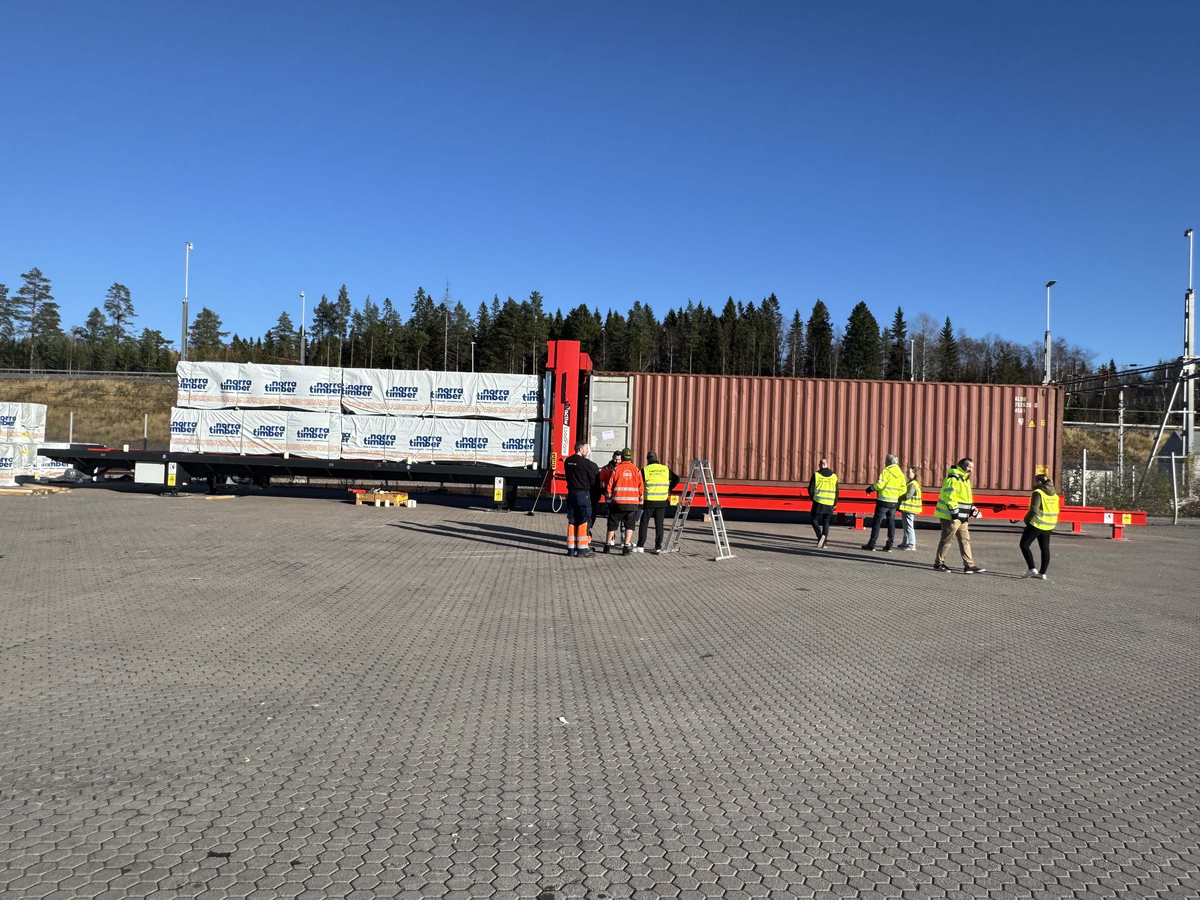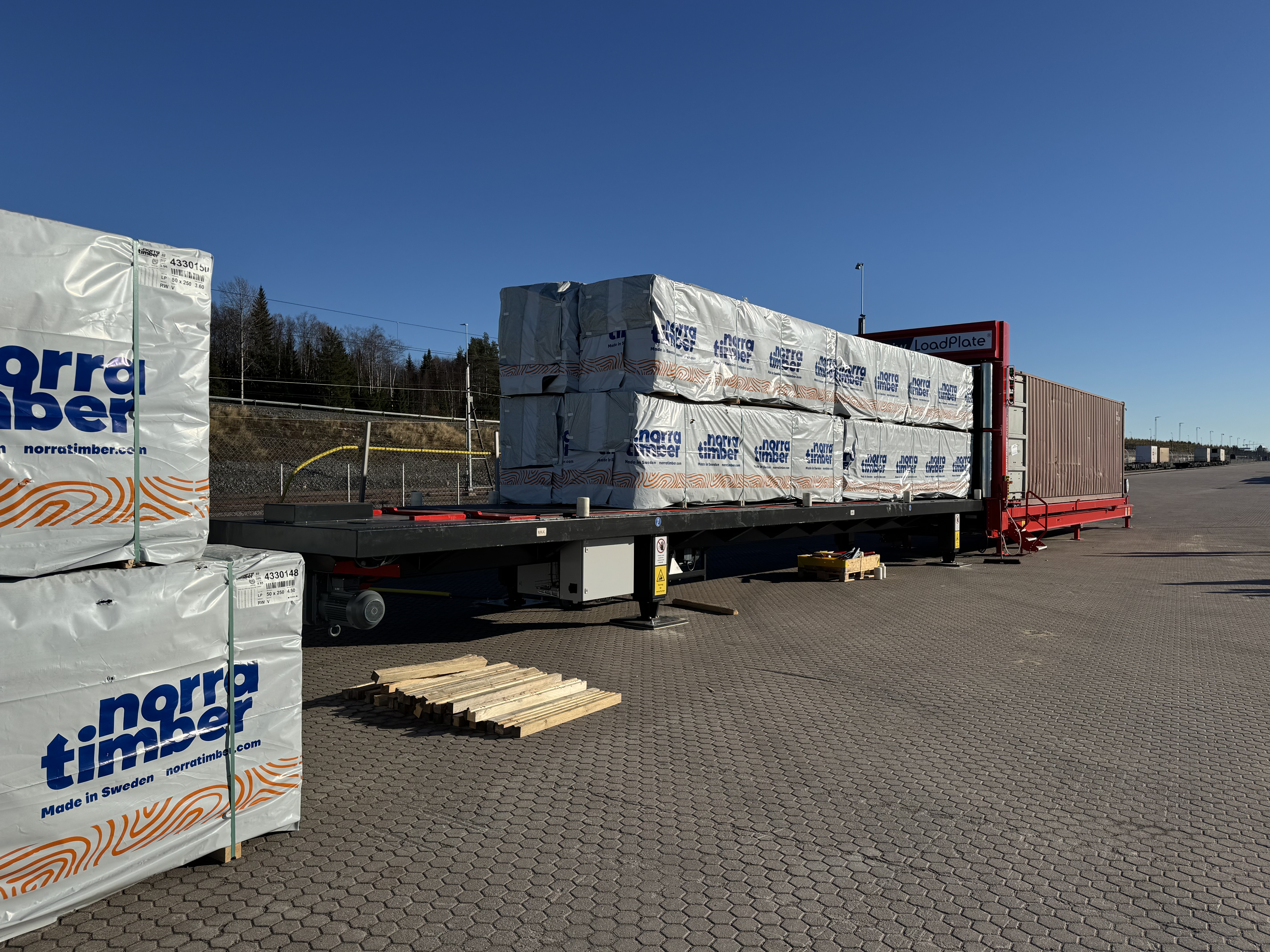 När den nya lastplattan invigdes i mitten av oktober stod ett stort lass sågad furu först i kön. Virket, från Norra Timber, skulle vidare till en kund i Saudiarabien. Den nya tekniken ska minska de långa lastbilstransporterna till hamnar i södra Sverige.